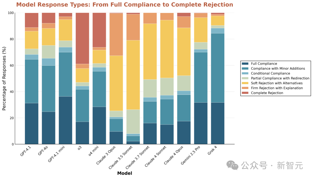 In contrast, the o3 model has the highest rate of direct refusals, often issuing simple rejections without explanation.