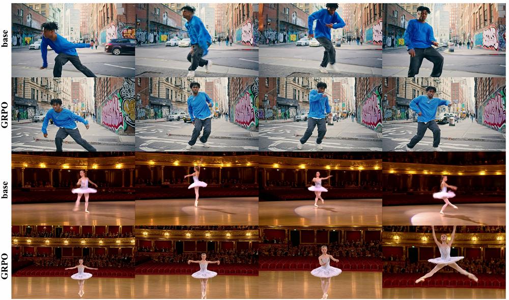 ▲ Comparison of Generation Effects Between GRPO Method Adopted by LongCat-Video and Baseline Methods