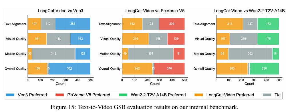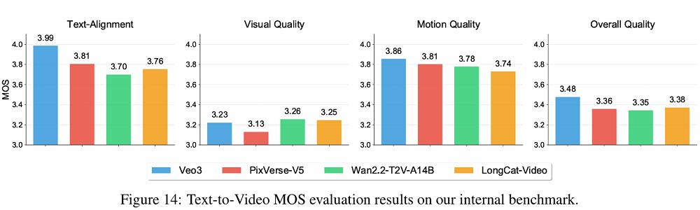 In terms of motion quality, the videos generated by LongCat-Video feature smooth movements and natural camera movements, demonstrating strong physical rationality. In text alignment, LongCat-Video performs slightly worse than Veo3.