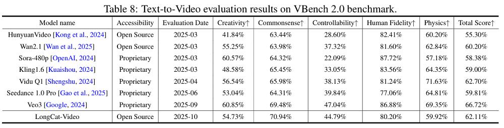 On the public evaluation platform VBench 2.0, LongCat-Video ranks first among all open-source models in "common sense understanding" with a score of 70.94%. Its overall score reaches 62.11%, second only to commercial closed-source models such as Google’s Veo3 and Vidu Q1 from Shenshu Technology.