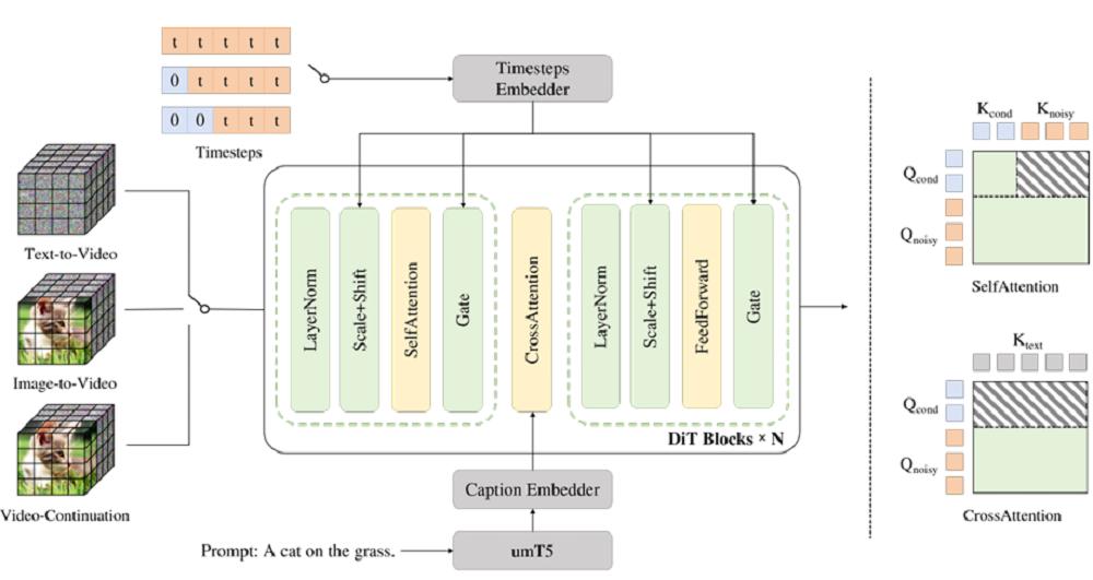 Instead of designing separate models for different video generation tasks, the team enabled all three tasks to share the same network through a "unified task framework." The model automatically determines the task type by identifying the number of "conditional frames" in the input: text-to-video is executed when input is zero-frame, image-to-video when one-frame, and video continuation when multi-frame.