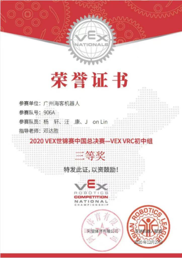2020VEX世锦赛中国总决赛是J*on Lin首次参加的世界级大赛,便荣获了三等奖的好成绩,这对于他来说是莫大的鼓励!